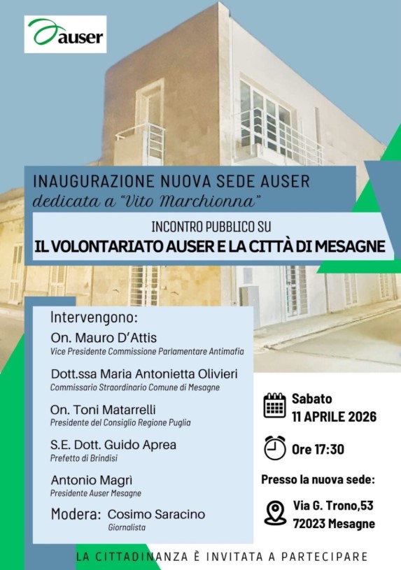 Sabato 11 aprile 2026, alle ore 17:30, verrà inaugurata la nuova sede dell’Auser dedicata a "Vito Marchionna".