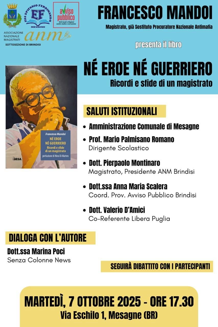 L’iniziativa è promossa dall’Amministrazione comunale di Mesagne e dalla Sottosezione brindisina dell’Associazione “Nazionale Magistrati”, presieduta dal Pubblico Ministero Pierpaolo Montinaro, coordinatore del gruppo specializzato in violenza di genere presso la Procura della Repubblica di Brindisi. Francesco Mandoi, infaticabile protagonista della lotta alla criminalità organizzata, Sostituto Procuratore della Repubblica a Brindisi e presso le Direzioni Distrettuali Antimafia di Lecce e Potenza, nonché Sostituto Procuratore presso la Direzione Nazionale Antimafia e Antiterrorismo e Capo della Segreteria del Sottosegretario alla Giustizia Giuseppe Ayala, affida ad un volume di altissimo valore civile il racconto della sua esperienza professionale al servizio allo Stato, tra memorie intime, riflessioni personali e un invito all’impegno quotidiano come singoli e come collettività.