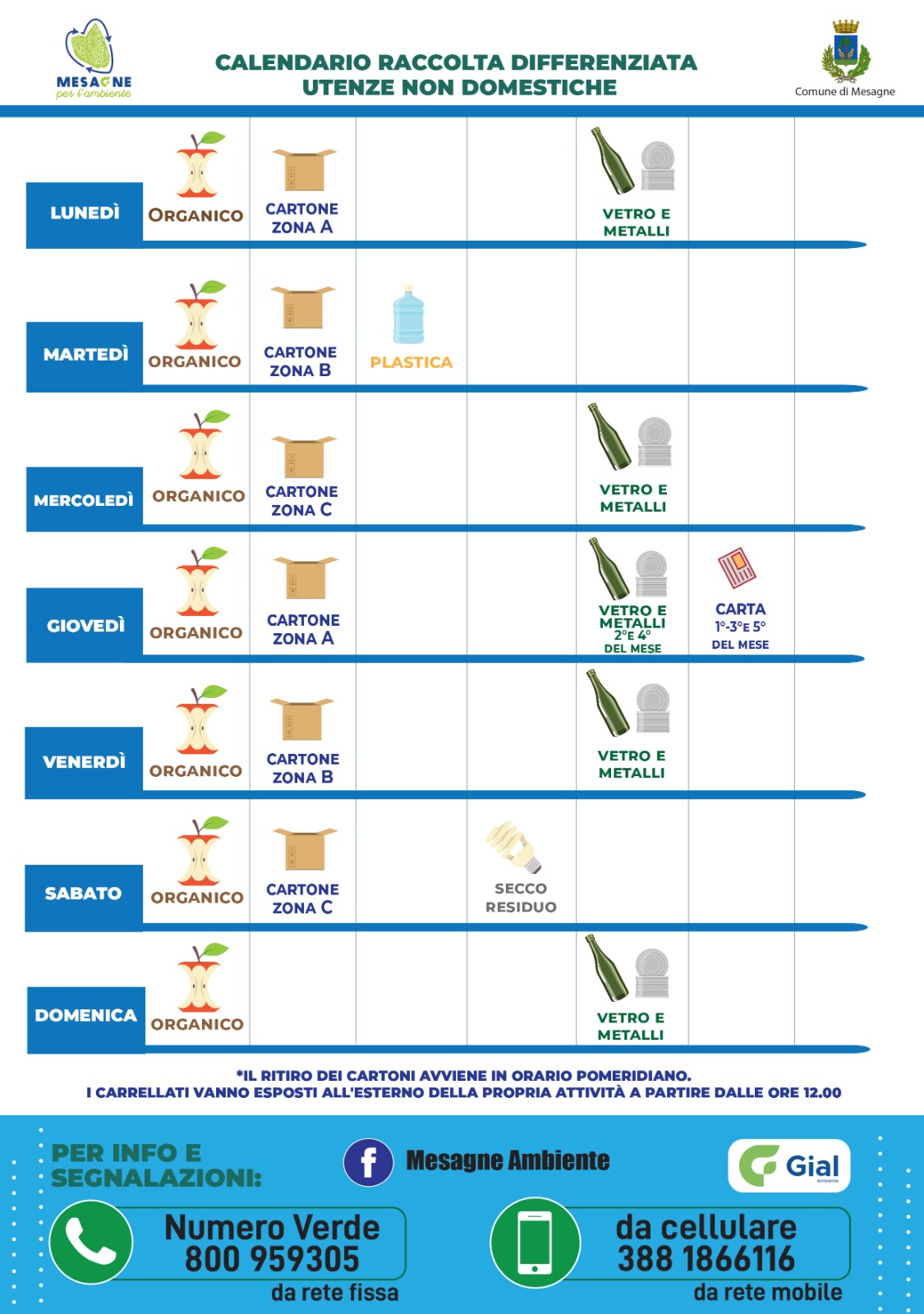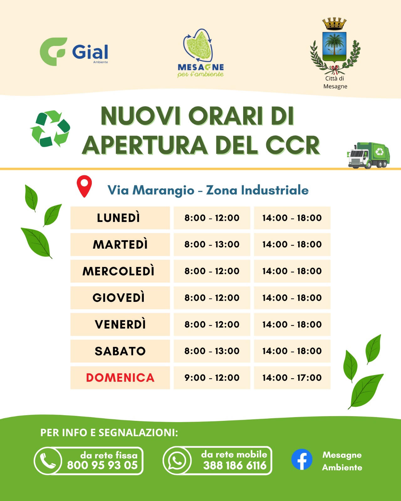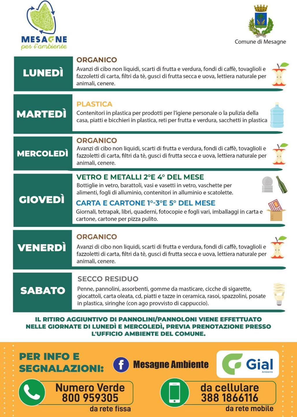 La società Gial Ambiente, dal 1° ottobre 2025 soggetto gestore per il servizio di igiene urbana della città di Mesagne, informa sulle novità del sistema di raccolta dei rifiuti, effettuato in un arco temporale che va dalle 6.00 alle 18.00 e dell'istituzione di una squadra qualità e decoro che garantirà supporto all'attività pomeridiana di raccolta. Per quel che concerne strettamente la raccolta porta a porta, non ci sarà più la doppia raccolta di carta e vetro nello stesso giorno; queste frazioni verranno ritirate a settimane alterne al fine di migliorare la qualità della raccolta differenziata porta a porta con benefici per la sostenibilità ambientale e il decoro della città.